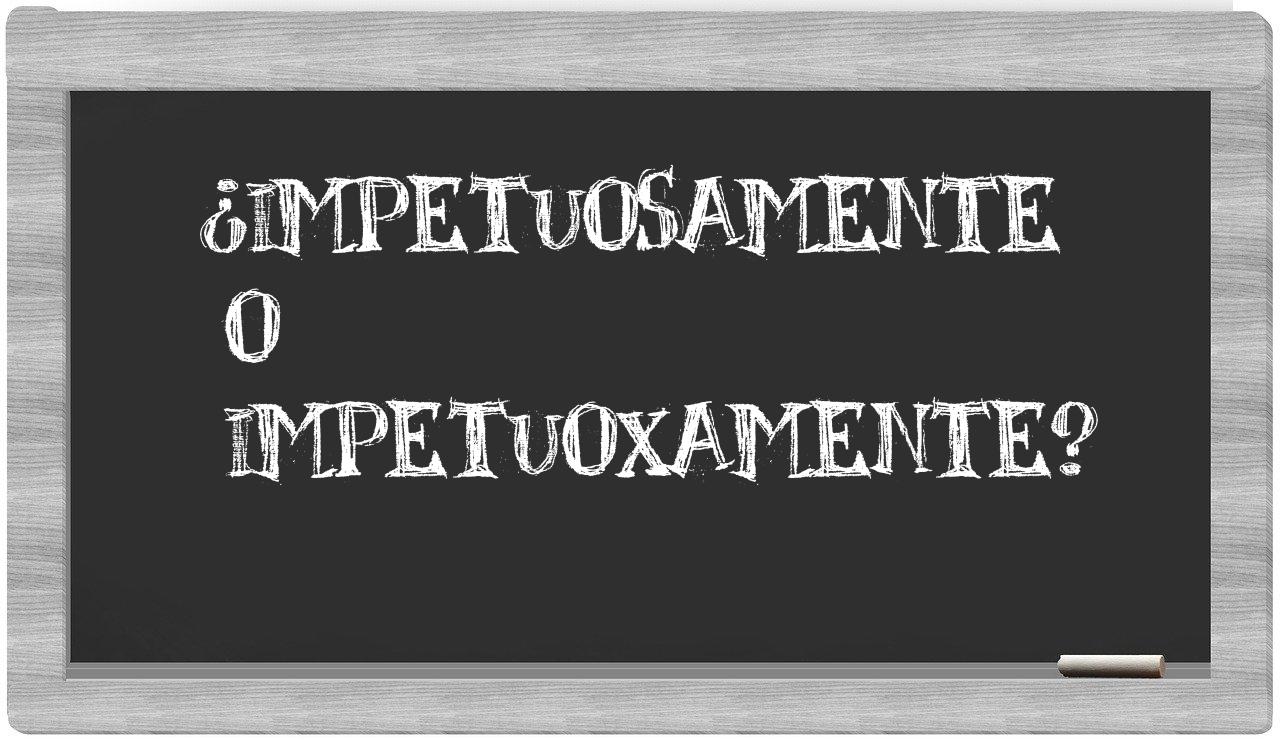 En la situación específica que involucra las palabras impetuosamente y impetuoxamente, no hay lugar para la indecisión, pues únicamente impetuosamente se encuentra correctamente redactada. La palabra impetuoxamente carece de reconocimiento en el Diccionario de la Real Academia Española.