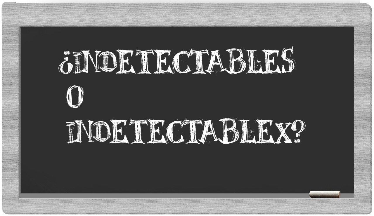 Cuando se trata de los términos indetectables y indetectablex, no deberías titubear en tu elección, porque únicamente indetectables es el que se encuentra correctamente redactado. Por otro lado, indetectablex no figura en el Diccionario de la Real Academia de la Lengua.