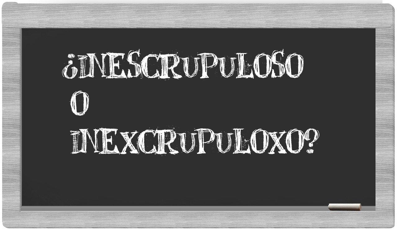 Cuando se trata de elegir entre inescrupuloso y inexcrupuloxo, la decisión es evidente, puesto que solo inescrupuloso refleja la forma adecuadamente registrada, mientras que inexcrupuloxo no se encuentra en el repertorio del Diccionario de la Real Academia Española.