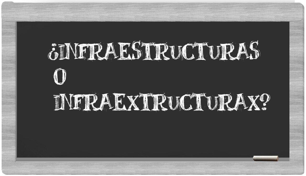 Cuando se trata de las palabras infraestructuras y infraextructurax, no hay motivo para la confusión, puesto que únicamente infraestructuras es la forma adecuada; de hecho, infraextructurax no se encuentra registrada en el Diccionario de la Real Academia de la Lengua.