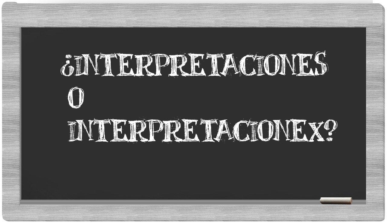 Cuando se trate de la elección entre interpretaciones y interpretacionex, no deberías titubear, pues únicamente interpretaciones se presenta con la ortografía adecuada. Por otro lado, interpretacionex no figura en el Diccionario de la Real Academia Española.