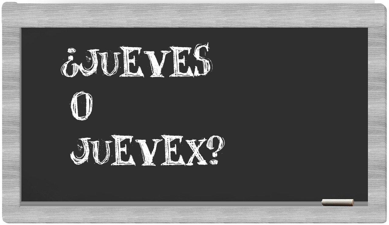 Cuando te enfrentes a la elección entre jueves y juevex, es fundamental que no vaciles, puesto que únicamente jueves representa la forma adecuada. Recuerda que juevex no está recogida en el Diccionario de la Real Academia Española.