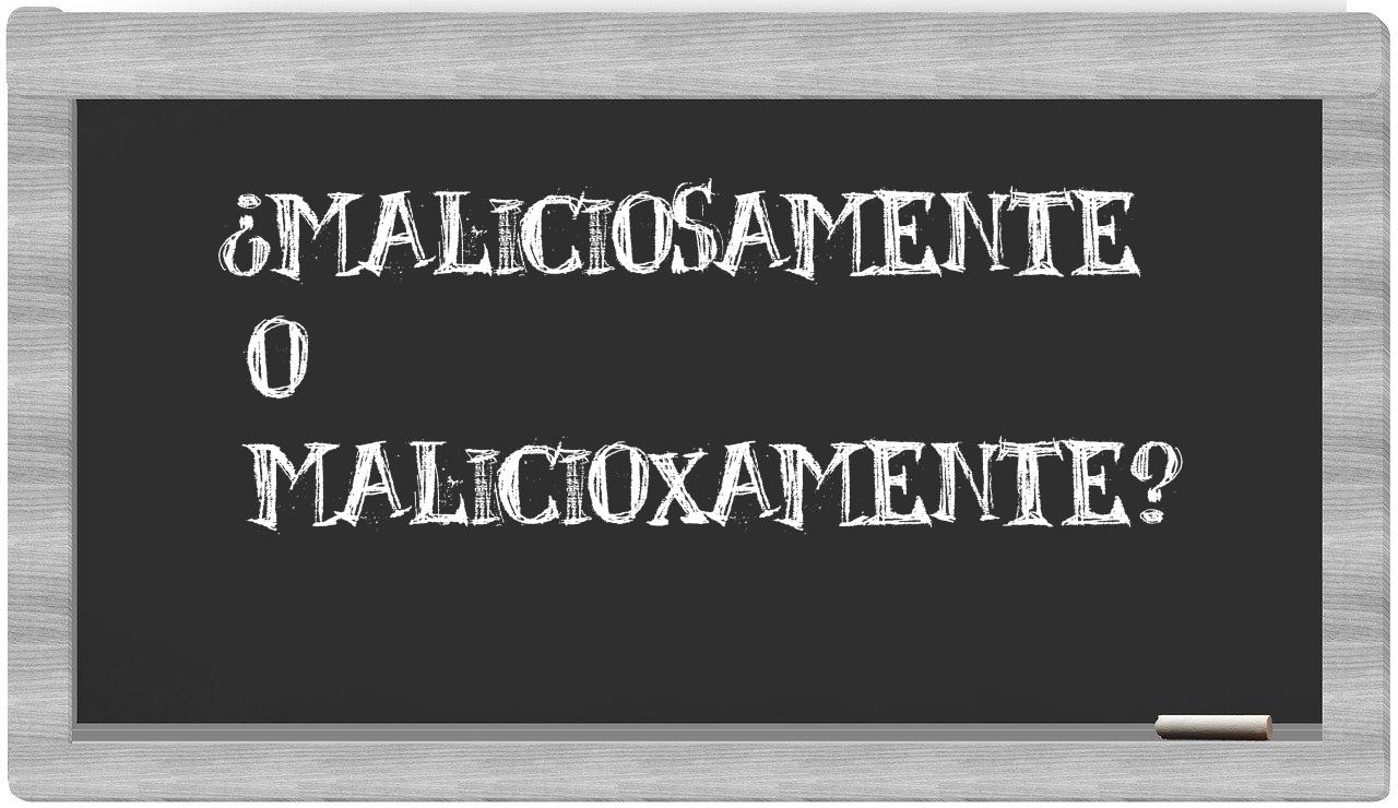 En la situación particular que compara los términos maliciosamente y malicioxamente, no deberías vacilar, pues únicamente maliciosamente es la forma correcta de escribirlo; la palabra malicioxamente no está registrada en el Diccionario de la Real Academia Española.