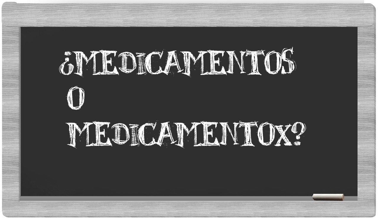 Cuando se trate de la elección entre medicamentos y medicamentox, no deberías titubear, pues únicamente medicamentos se presenta con la ortografía adecuada. Por otro lado, medicamentox no figura en el Diccionario de la Real Academia Española.