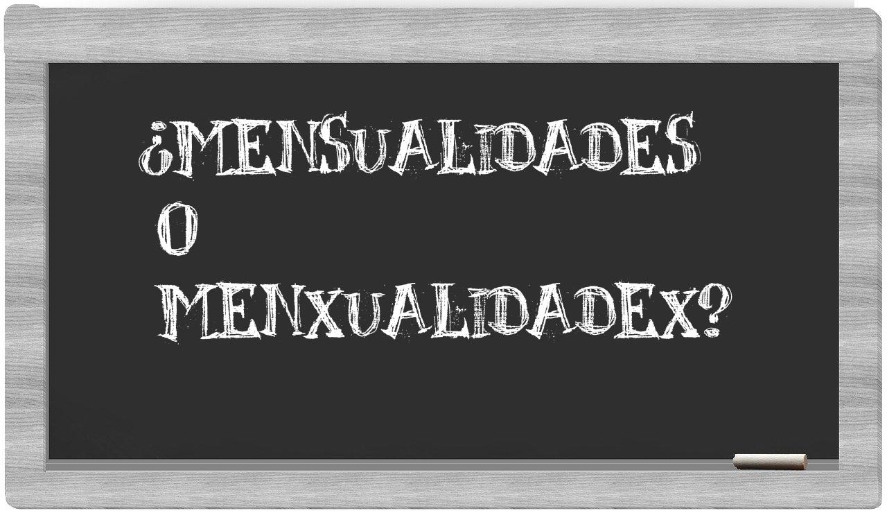 Cuando se trata de elegir entre mensualidades y menxualidadex, no deberías titubear, ya que únicamente la forma mensualidades es la adecuada, mientras que menxualidadex no figura en el prestigioso Diccionario de la Real Academia Española.