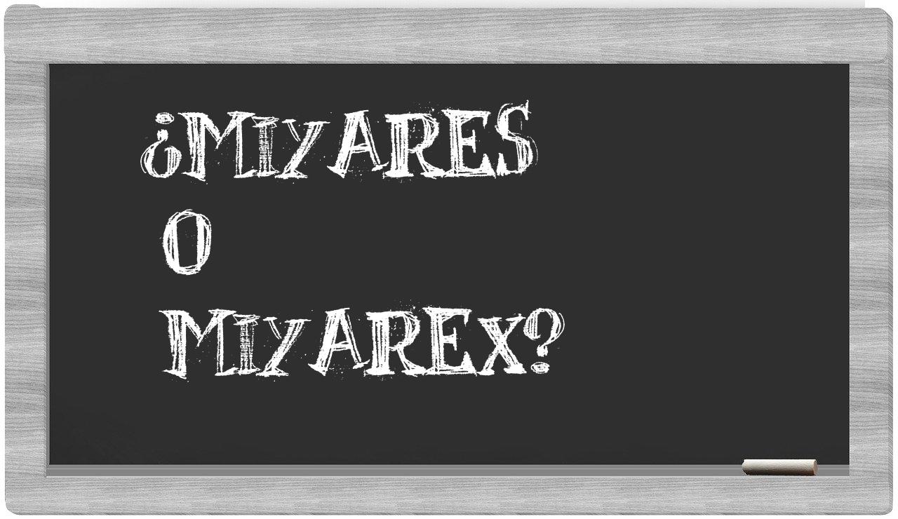 Cuando se trata de la combinación entre el término miyares y el vocablo miyarex, es fundamental que no experimentes vacilaciones, porque exclusivamente miyares es la forma adecuada. Por otro lado, miyarex no se encuentra en el repertorio de la Real Academia Española.