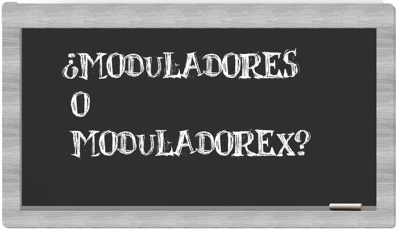 Cuando se presenta la disyuntiva entre moduladores y moduladorex, no hay razón para titubear, puesto que solo moduladores cuenta con la aprobación del Diccionario de la Real Academia Española, mientras que moduladorex no se encuentra registrado en sus páginas.
