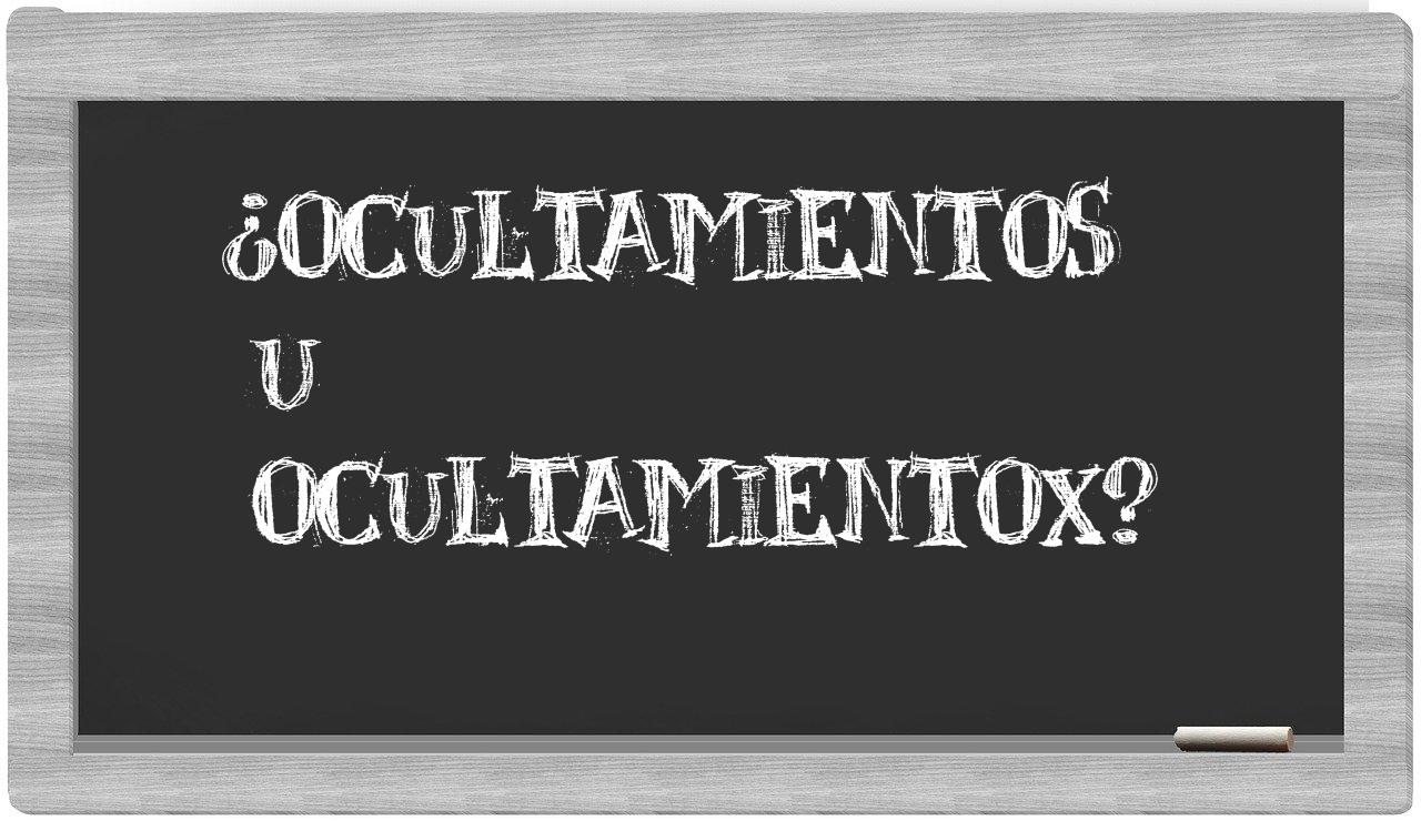 Cuando te sitúas ante la disyuntiva entre ocultamientos y ocultamientox, no existe motivo alguno para titubear, dado que únicamente ocultamientos es la opción correctamente asentada en el idioma, mientras que ocultamientox carece de reconocimiento en el Diccionario de la Real Academia Española.