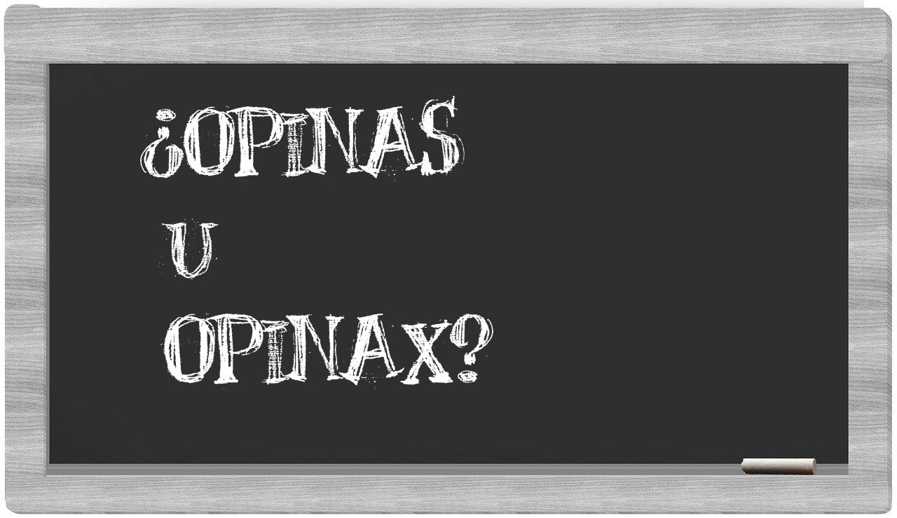 La mezcla entre opinas y opinax generalmente surge por la semejanza en su pronunciación. En gran parte de los acentos del español, ambas palabras se oyen casi idénticas, lo que puede inducir a errores en su escritura. No obstante, la forma correcta de cada una está determinada por su raíz etimológica y las normas particulares de la ortografía del español.