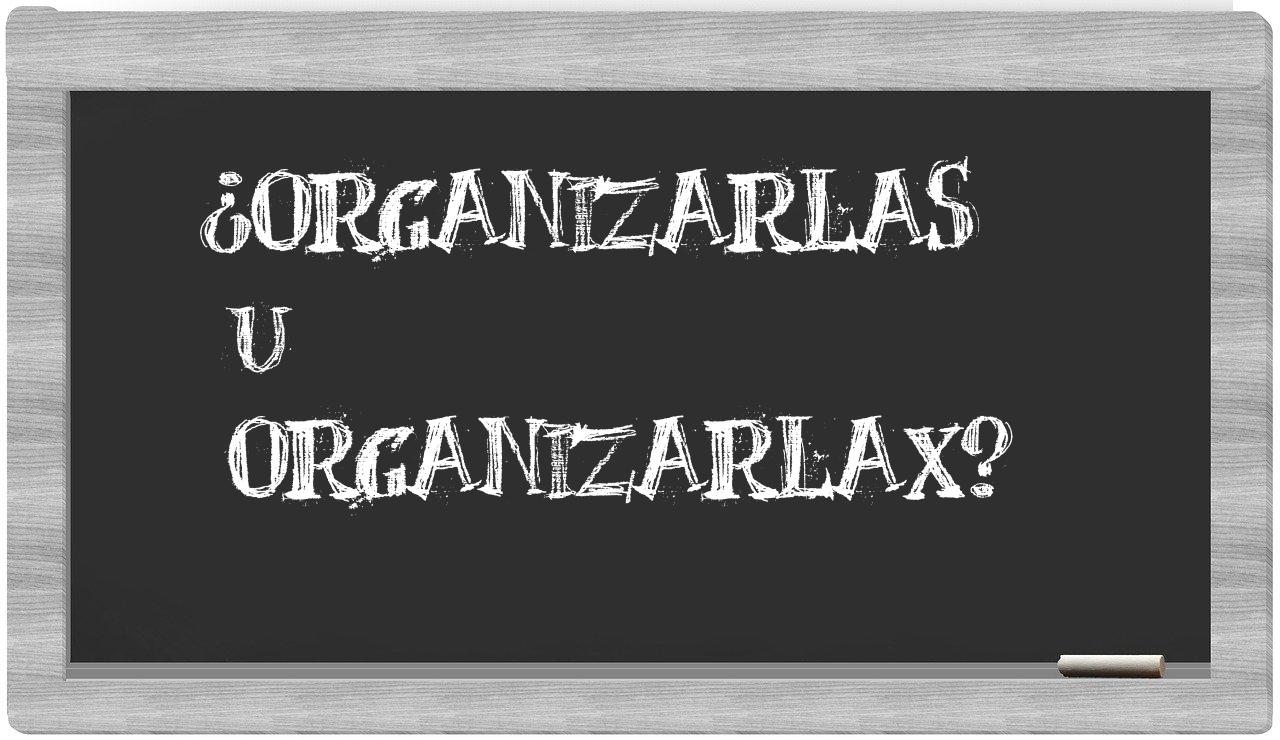 Cuando se trata de la distinción entre organizarlas y organizarlax, nunca deberías titubear, puesto que únicamente organizarlas es la opción que se encuentra correctamente formulada; organizarlax carece de reconocimiento en el Diccionario de la Real Academia Española.