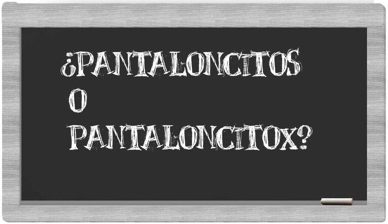 En la particular circunstancia que se presenta entre los términos pantaloncitos y pantaloncitox, nunca deberías titubear, puesto que únicamente pantaloncitos se encuentra correctamente redactado. Por otro lado, pantaloncitox no se halla en el léxico de la Real Academia Española.