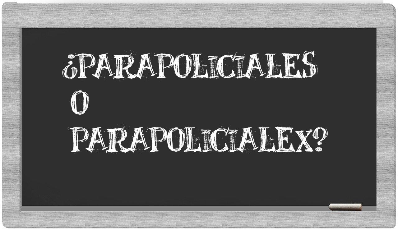 Cuando se presenta la disyuntiva entre parapoliciales y parapolicialex, es menester que no haya lugar a la incertidumbre, puesto que solo parapoliciales se encuentra debidamente consignada en el Diccionario de la Real Academia Española, mientras que parapolicialex se encuentra ausente en sus páginas oficiales.