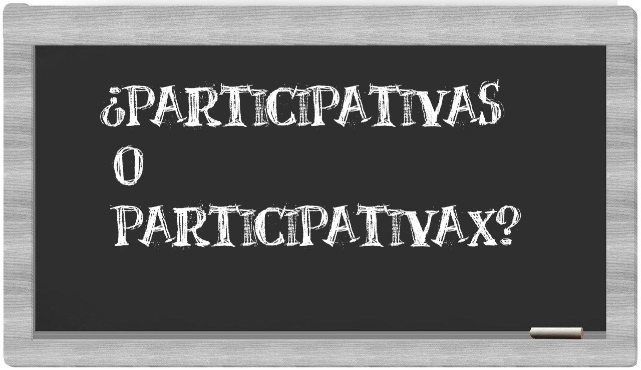 En la particular situación que involucra a participativas y participativax, no deberías vacilar en tu elección, puesto que únicamente participativas está correctamente formulada. Por su parte, participativax no está registrada en el prestigioso Diccionario de la Real Academia Española.