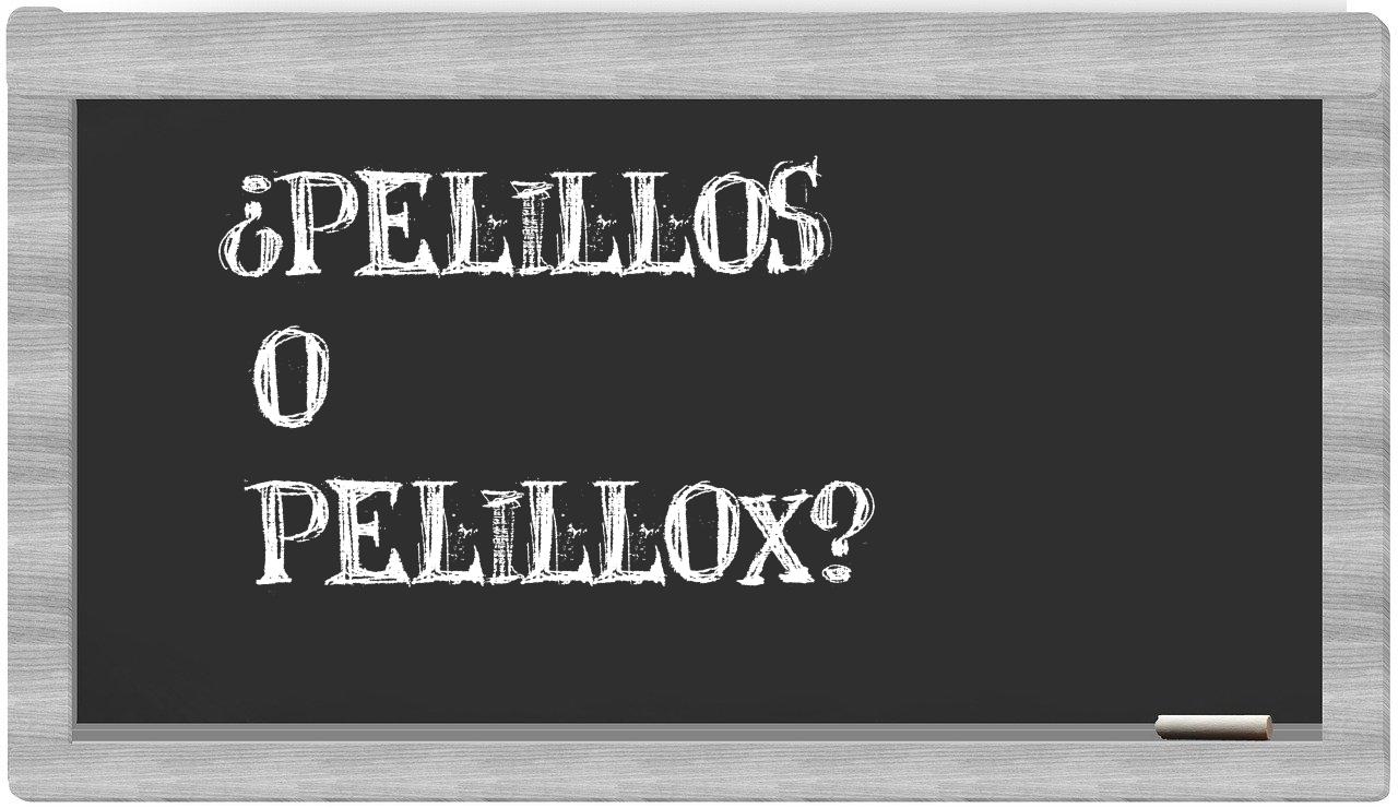 En la situación específica en la que se encuentren las voces pelillos y pelillox, no deberías titubear, pues únicamente la forma pelillos es la que presenta una escritura adecuada. Por otro lado, pelillox carece de presencia en el repertorio del Diccionario de la Real Academia Española.