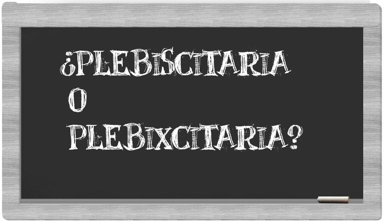 En la particular situación que involucra los términos plebiscitaria y plebixcitaria, no deberías titubear en ningún momento, dado que únicamente plebiscitaria se encuentra correctamente redactada. Por otro lado, plebixcitaria no se halla en el Diccionario de la Real Academia Española.