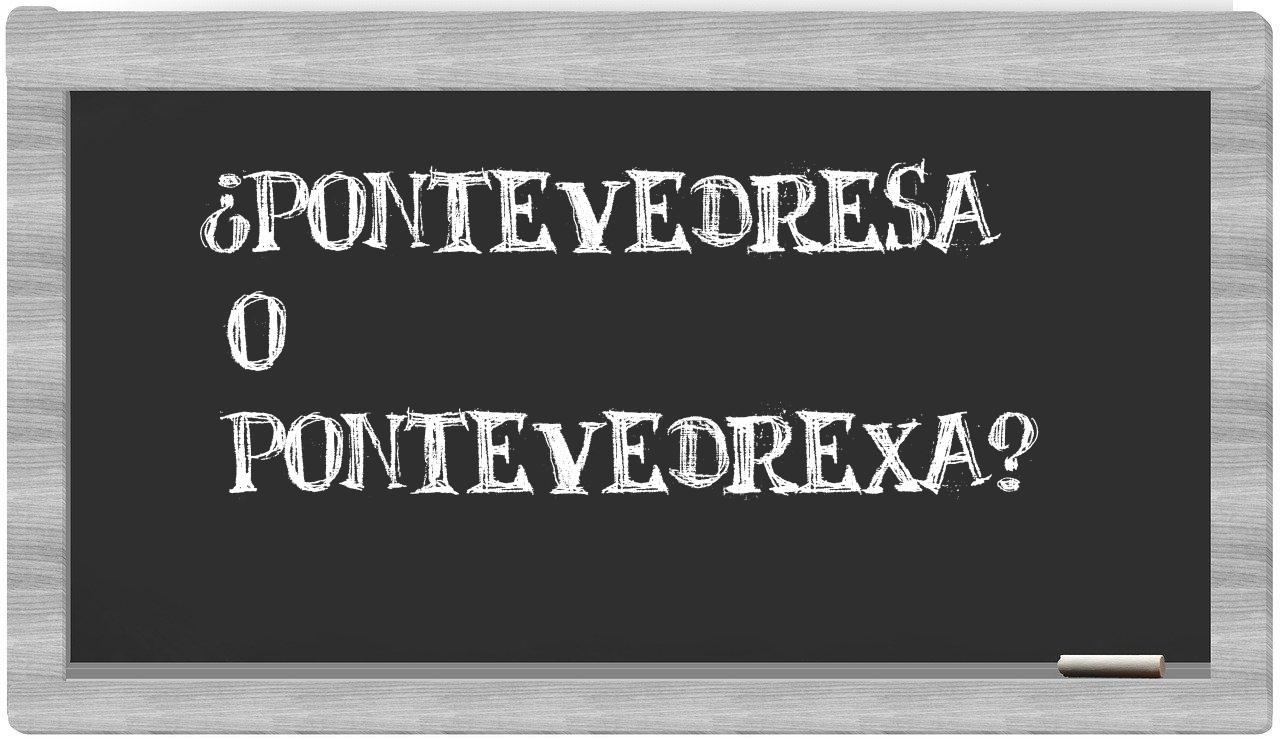 En la situación particular que se presenta entre los términos pontevedresa y pontevedrexa, es fundamental que no te sientas inseguro, puesto que únicamente pontevedresa es la forma correcta de escribirlo. El término pontevedrexa, por su parte, no figura en el Diccionario de la Real Academia Española.