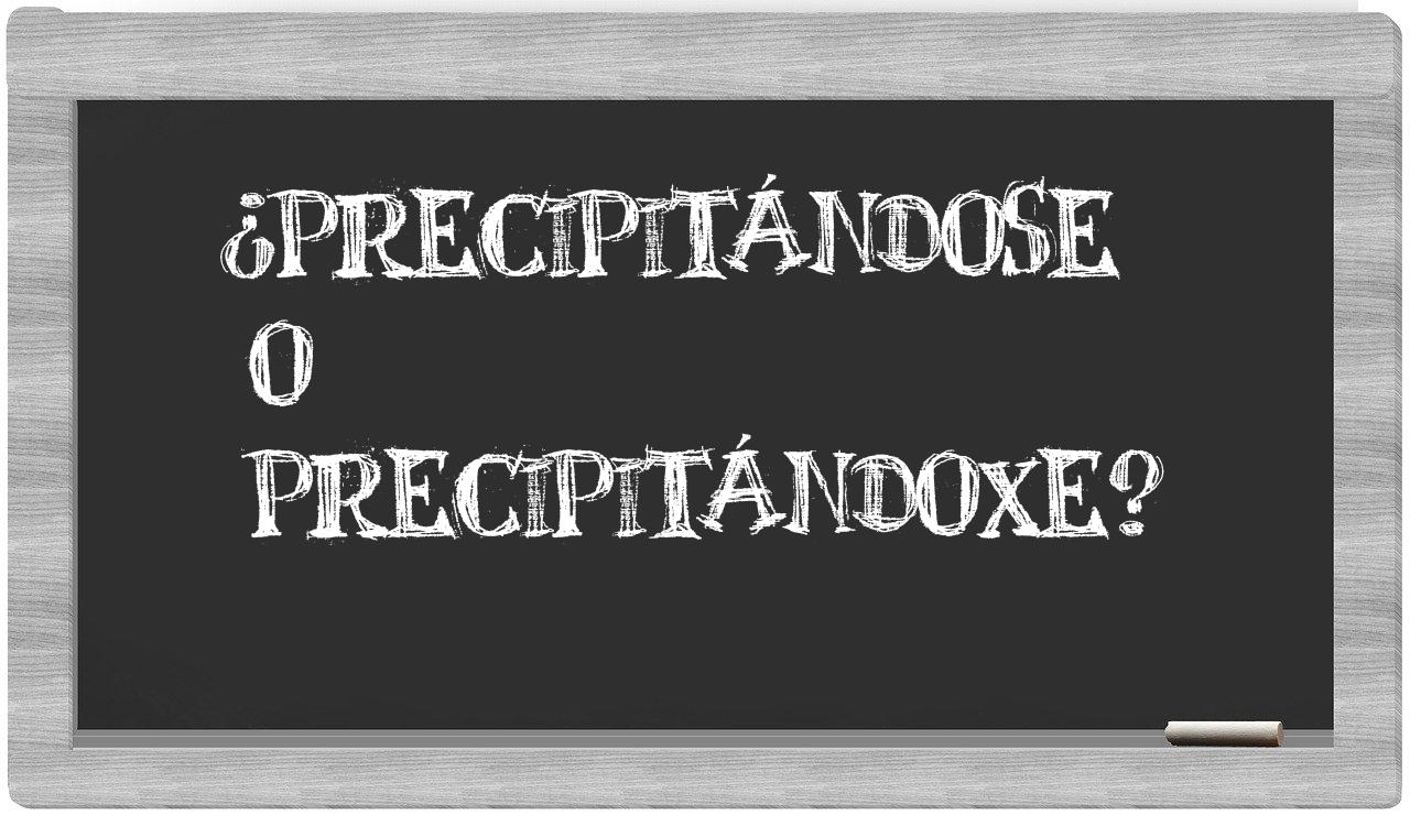 En la situación particular que involucra los términos precipitándose y precipitándoxe, no hay motivo para vacilar, puesto que únicamente precipitándose se encuentra debidamente registrada. Por otro lado, precipitándoxe no figura en el repertorio de la Real Academia Española.