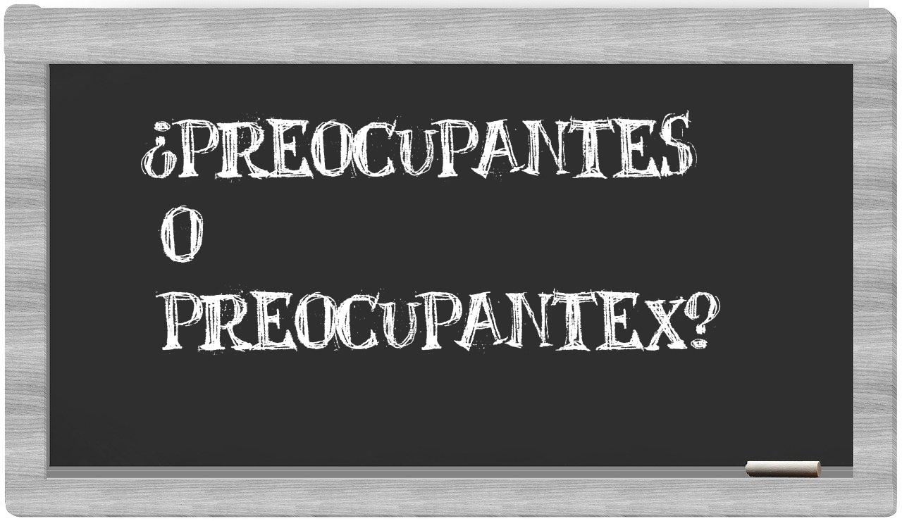 En la particularidad que rodea a las voces preocupantes y preocupantex, nunca deberías titubear, porque es únicamente preocupantes la que se presenta de manera adecuada. La forma preocupantex no figura en el Diccionario de la Real Academia Española.