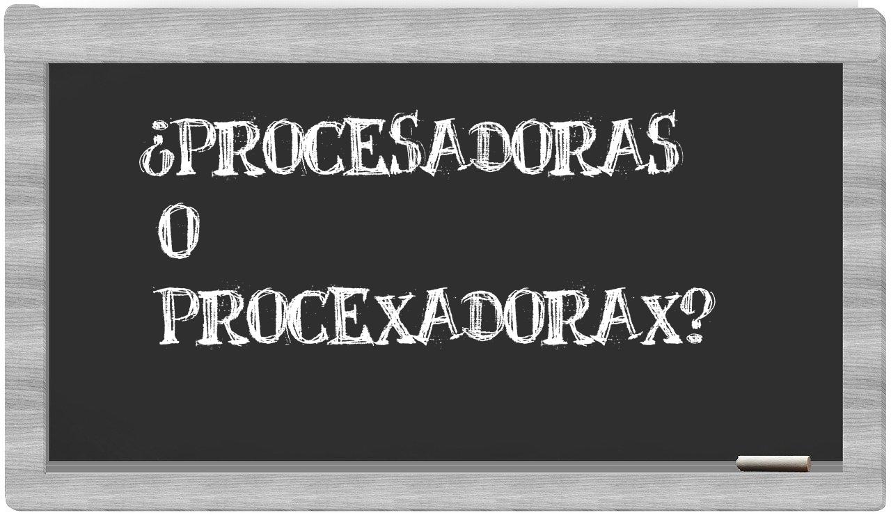 Cuando se trate de elegir entre los términos procesadoras y procexadorax, es fundamental que tengas claridad, puesto que únicamente procesadoras es la forma adecuada; procexadorax no está registrada en el Diccionario de la Real Academia Española.