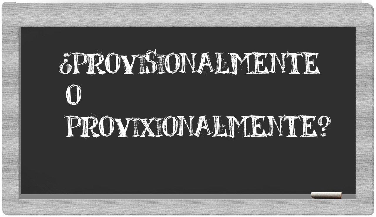 Cuando se trata de elegir entre provisionalmente y provixionalmente, no deberías vacilar en tu decisión, puesto que únicamente provisionalmente es la forma correcta de la palabra; por otro lado, provixionalmente no se encuentra registrada en el Diccionario de la Real Academia Española.