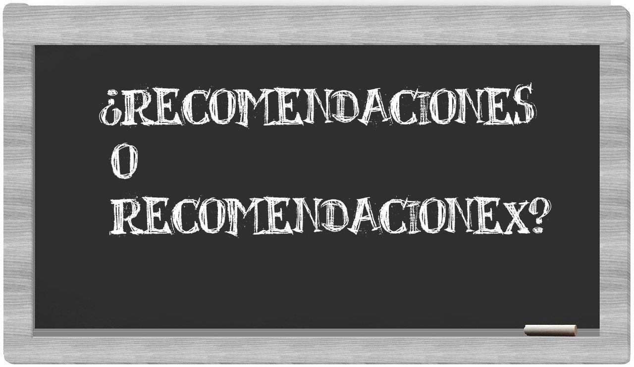Cuando se trata de los términos recomendaciones y recomendacionex, no deberías titubear en tu elección, porque únicamente recomendaciones es el que se encuentra correctamente redactado. Por otro lado, recomendacionex no figura en el Diccionario de la Real Academia de la Lengua.