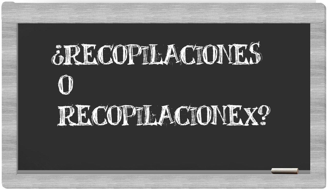 En lo que respecta a la comparación entre recopilaciones y recopilacionex, nunca deberías experimentar incertidumbre, porque únicamente recopilaciones es la forma correcta de escribirlo. Por otra parte, recopilacionex no tiene cabida en el Diccionario de la Real Academia Española.