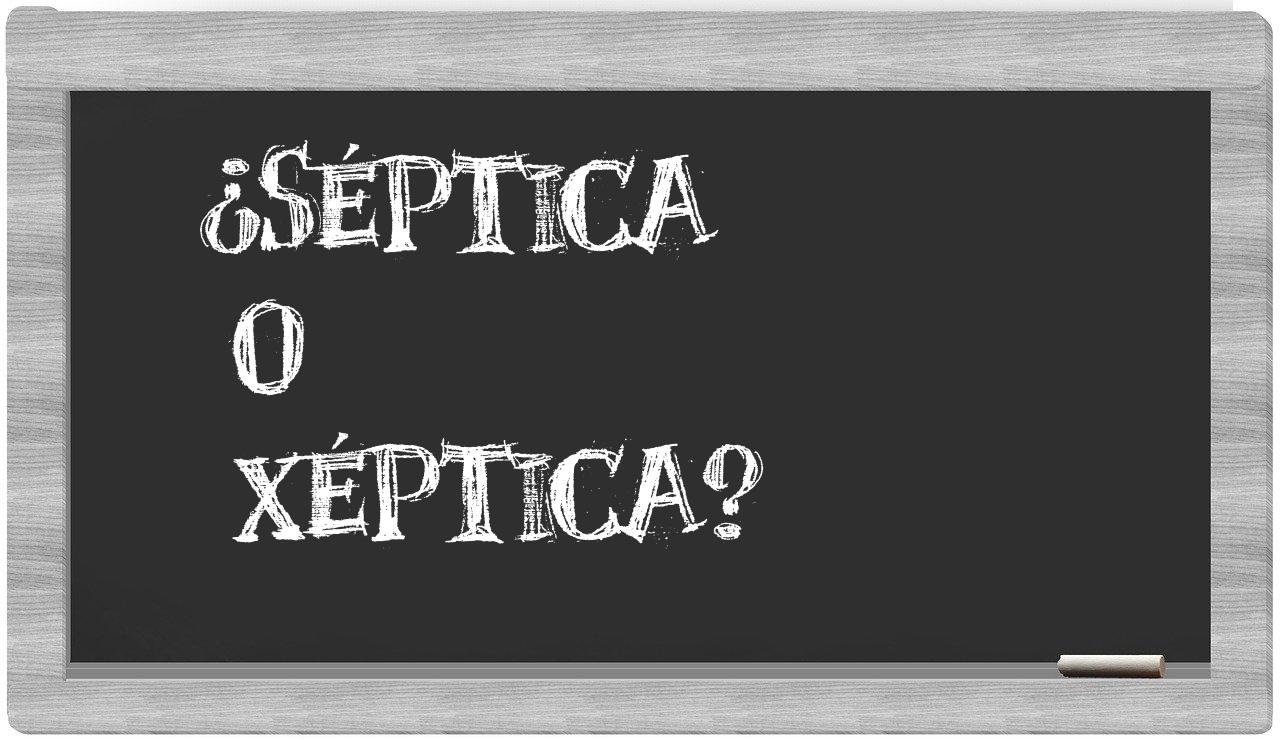 Cuando te encuentres frente a las palabras séptica y xéptica, no dejes lugar a la incertidumbre, puesto que únicamente séptica es la forma adecuada; de hecho, xéptica carece de reconocimiento en el Diccionario de la Real Academia Española.
