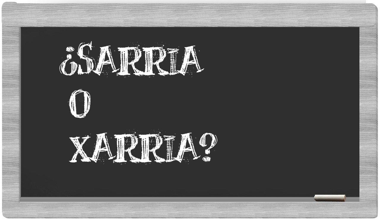 Cuando se trata de los términos sarria y xarria, no deberías titubear en tu elección, porque únicamente sarria es el que se encuentra correctamente redactado. Por otro lado, xarria no figura en el Diccionario de la Real Academia de la Lengua.