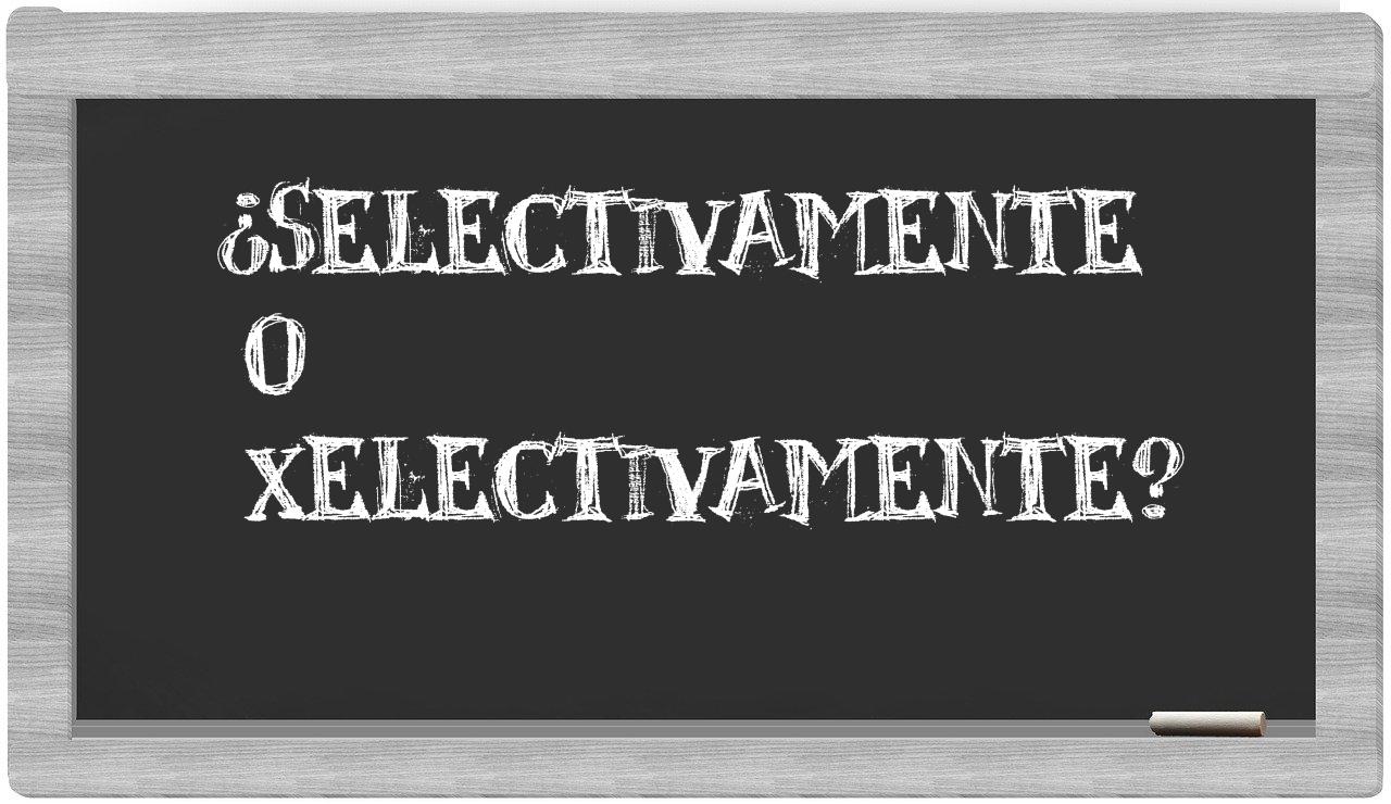 Cuando se trata de decidir entre el término selectivamente y la alternativa xelectivamente, la elección no puede ser más clara, puesto que selectivamente es la única que se encuentra debidamente registrada en el Diccionario de la Real Academia Española, mientras que xelectivamente no cuenta con reconocimiento oficial.