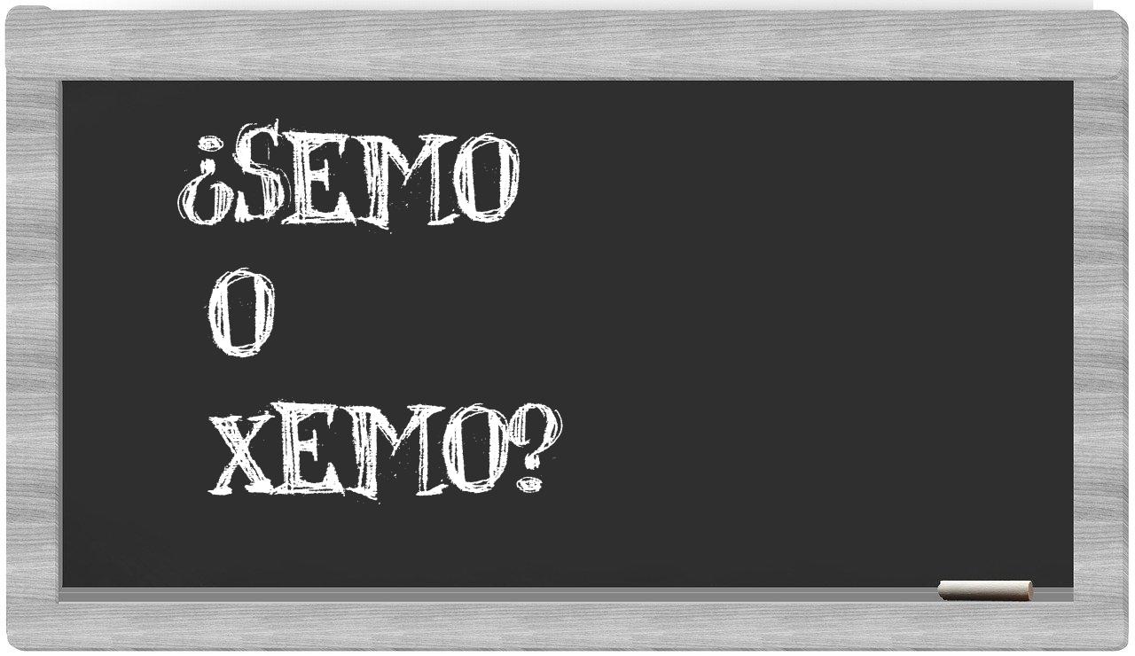 Cuando se trata del par de términos semo y xemo, nunca deberías titubear, pues solo semo es la opción que se encuentra bien formulada; por otro lado, xemo no figura en el Diccionario de la Real Academia Española.