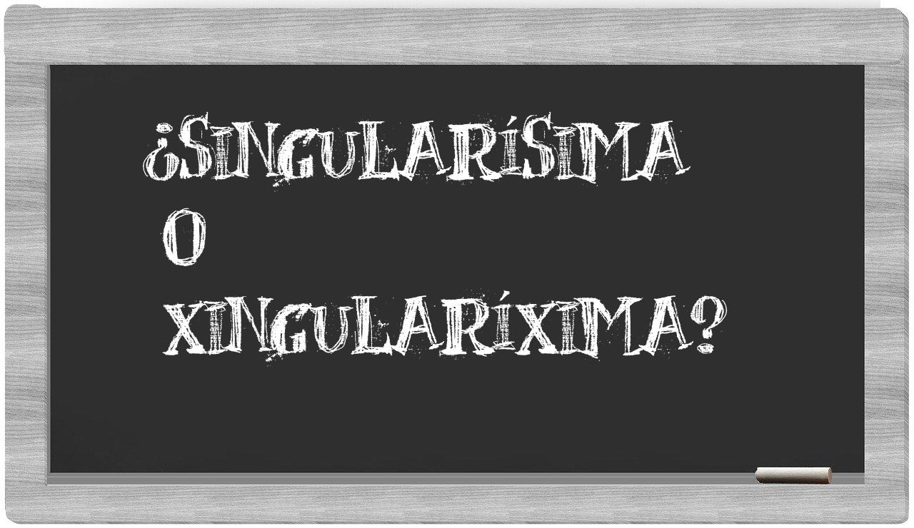 En la situación específica que se presenta entre singularísima y xingularíxima, la confianza en tu elección no debería vacilar, puesto que únicamente singularísima es la opción que se encuentra debidamente registrada. Por otro lado, xingularíxima no figura en el prestigioso Diccionario de la Real Academia Española.