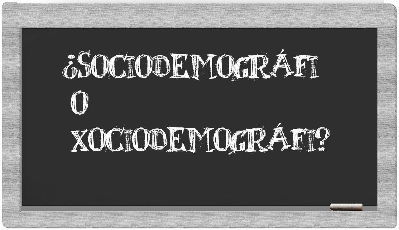 Cuando se trata del par de términos sociodemográfi y xociodemográfi, nunca deberías titubear, pues solo sociodemográfi es la opción que se encuentra bien formulada; por otro lado, xociodemográfi no figura en el Diccionario de la Real Academia Española.