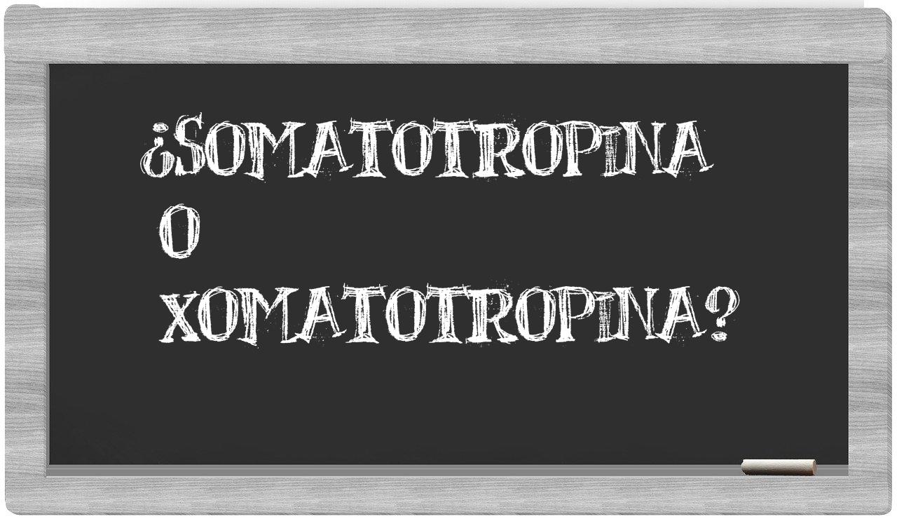 Cuando se trata de elegir entre somatotropina y xomatotropina, no deberías titubear en absoluto, dado que solo somatotropina se encuentra registrada correctamente, mientras que xomatotropina no tiene cabida en el Diccionario de la Real Academia Española.