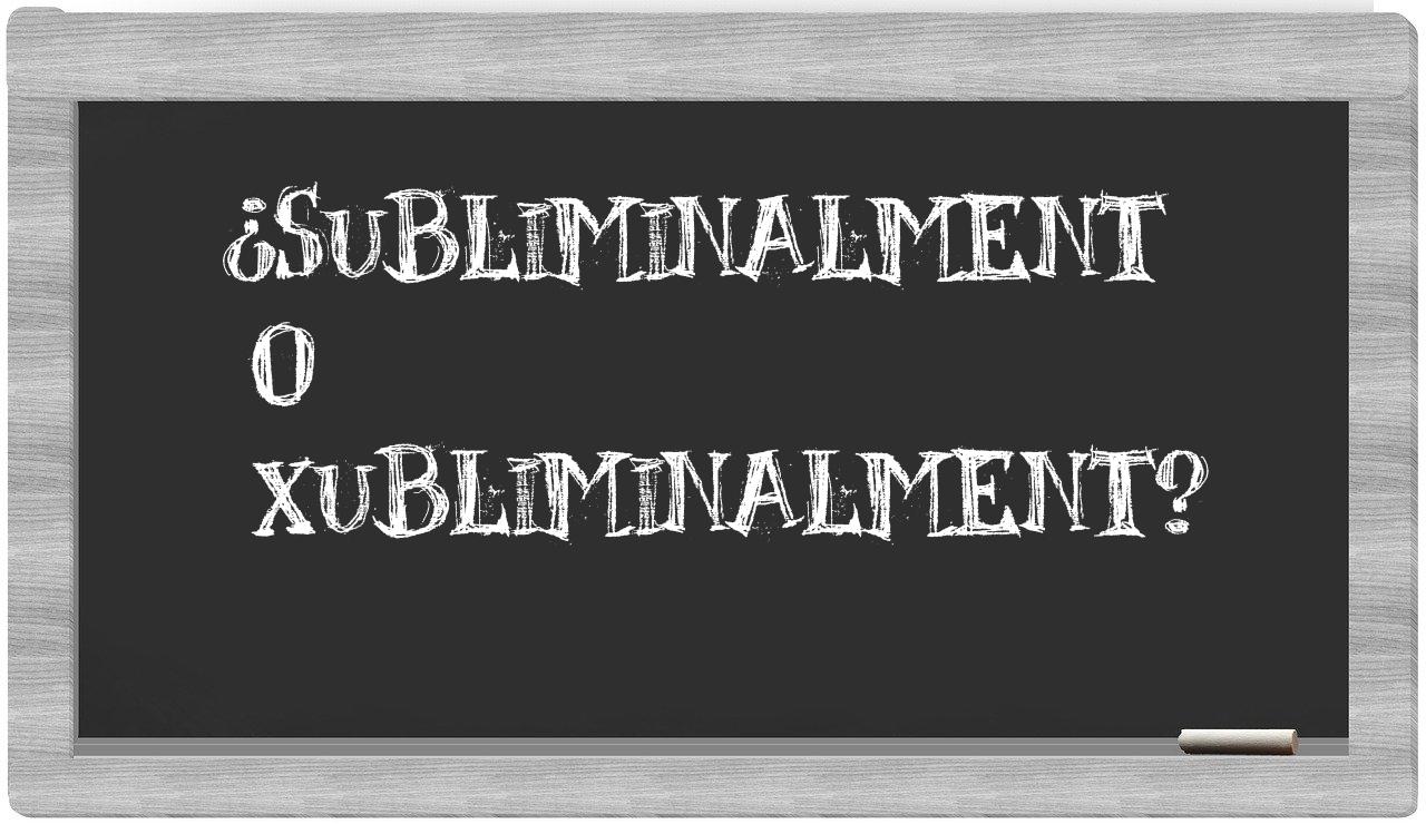 En la particular situación que involucra a subliminalment y xubliminalment, no deberías vacilar en tu elección, puesto que únicamente subliminalment está correctamente formulada. Por su parte, xubliminalment no está registrada en el prestigioso Diccionario de la Real Academia Española.