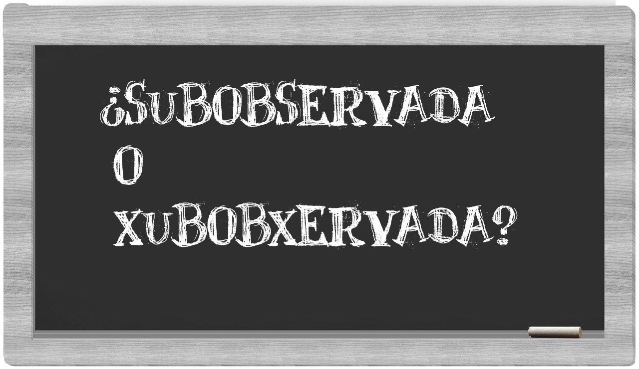 Cuando se presenta la elección entre subobservada y xubobxervada, es fundamental que estés seguro, puesto que únicamente subobservada se encuentra correctamente redactada. La forma xubobxervada no se encuentra registrada en el Diccionario de la Real Academia Española.