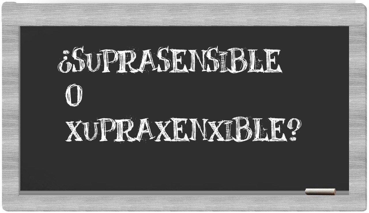 En la situación específica que involucra los términos suprasensible y xupraxenxible, nunca deberías titubear, puesto que únicamente suprasensible se encuentra debidamente registrada. Por otro lado, xupraxenxible no figura en el Diccionario de la Real Academia Española.