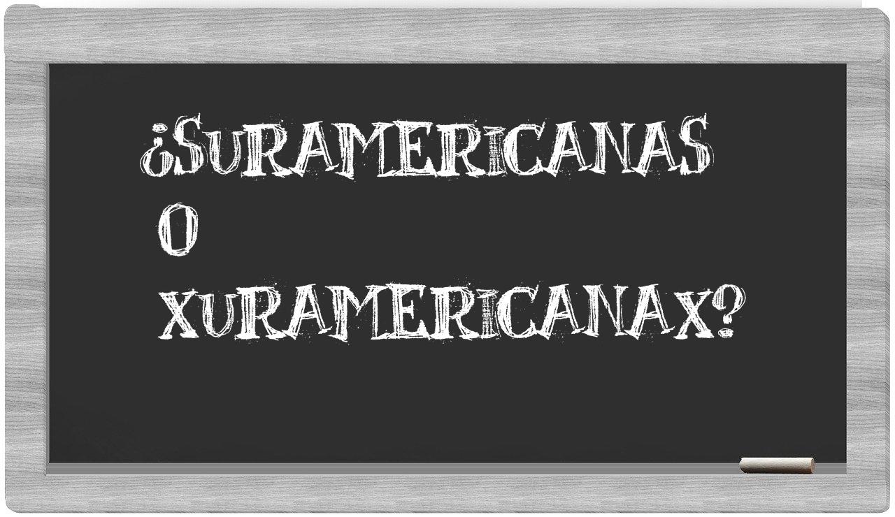 Cuando te encuentres ante las opciones de suramericanas y xuramericanax, no vaciles en tu elección, puesto que únicamente suramericanas es la que se encuentra debidamente aceptada, mientras que xuramericanax no figura en el Diccionario de la Real Academia Española.