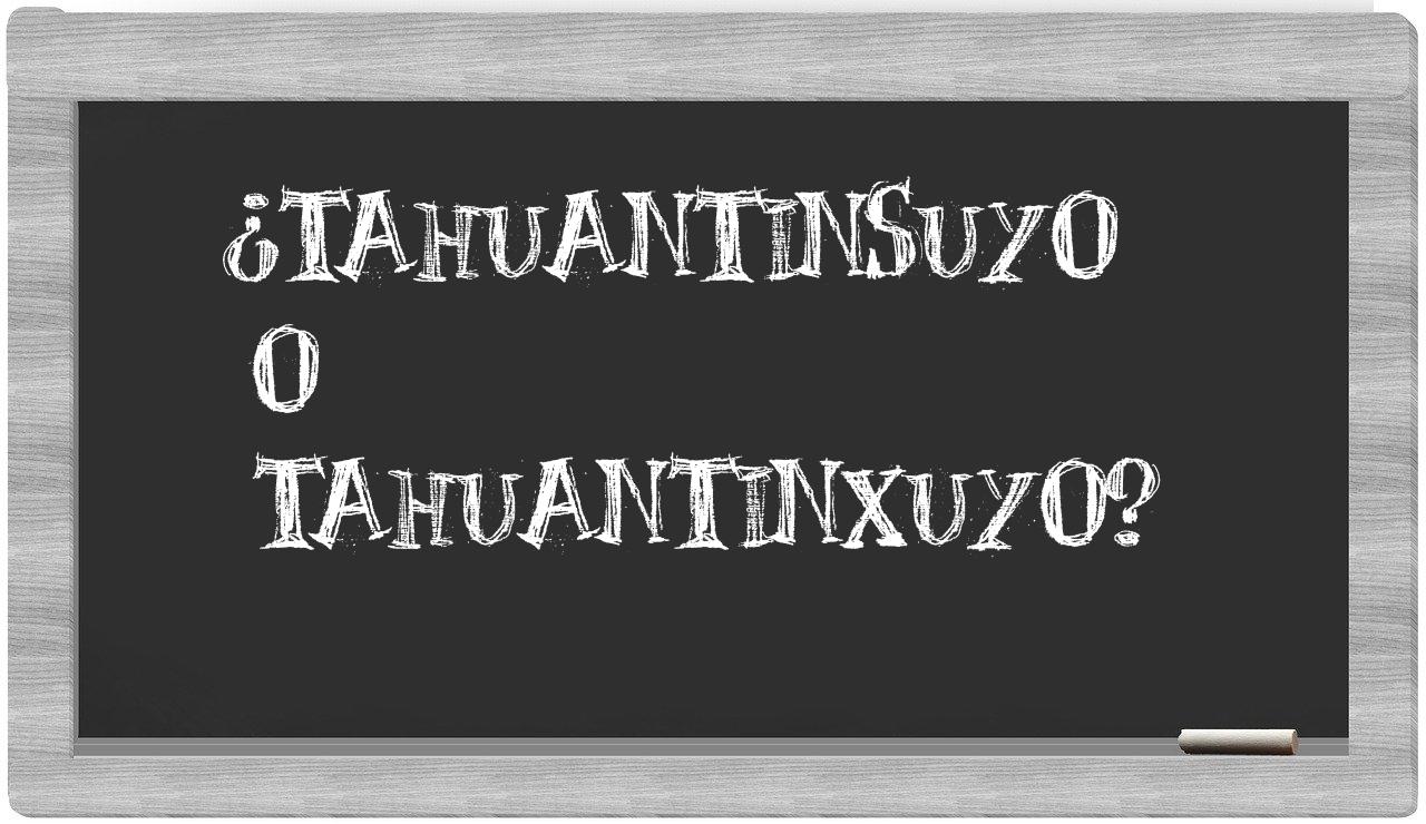 Cuando te enfrentes a la comparación de tahuantinsuyo y tahuantinxuyo, ten siempre presente que la forma correcta es tahuantinsuyo, pues tahuantinxuyo no tiene cabida en el Diccionario de la Real Academia de la Lengua.