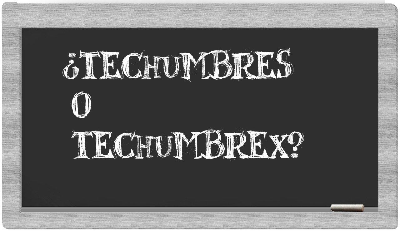 Cuando se presenta la disyuntiva entre techumbres y techumbrex, no hay lugar para la incertidumbre, puesto que únicamente techumbres es la forma adecuada, mientras que techumbrex no está registrada en el Diccionario de la Real Academia Española.