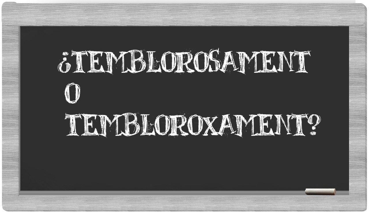 Cuando se trata de las palabras temblorosament y tembloroxament, nunca deberías tener vacilaciones, dado que únicamente temblorosament está correctamente redactada. Cabe mencionar que tembloroxament no se encuentra en el diccionario oficial de la Real Academia Española.