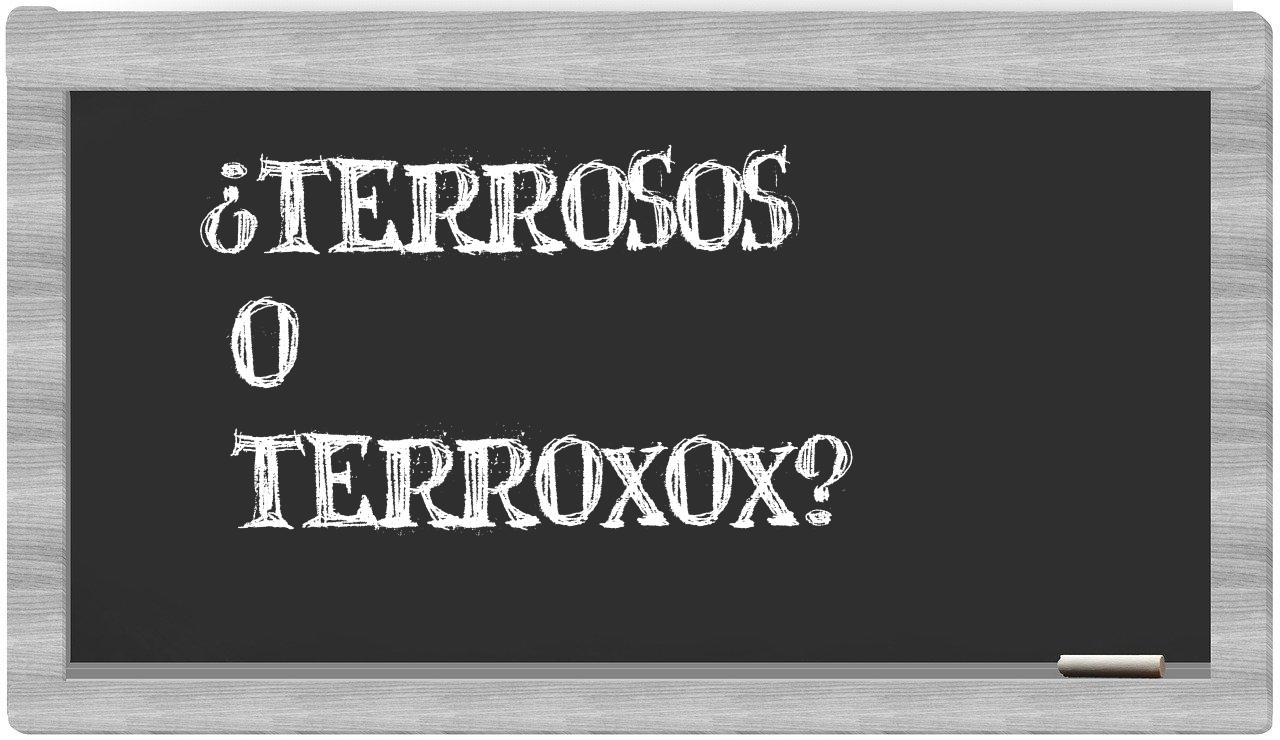 Cuando se trata de los términos terrosos y terroxox, no deberías titubear en tu elección, porque únicamente terrosos es el que se encuentra correctamente redactado. Por otro lado, terroxox no figura en el Diccionario de la Real Academia de la Lengua.
