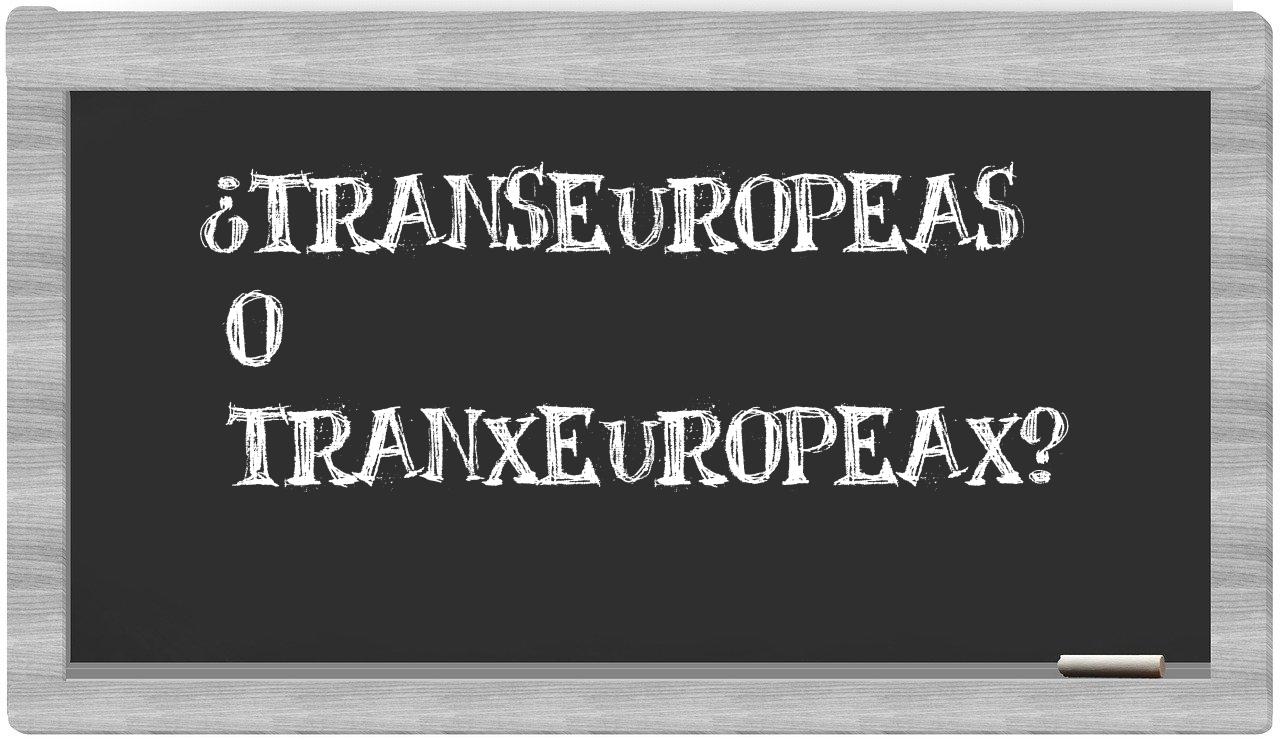 Cuando se trata de discernir entre transeuropeas y tranxeuropeax, la elección es clara y sin incertidumbres, puesto que exclusivamente transeuropeas se encuentra correctamente redactada; además, es importante señalar que tranxeuropeax no figura en el repertorio del Diccionario de la Real Academia Española.