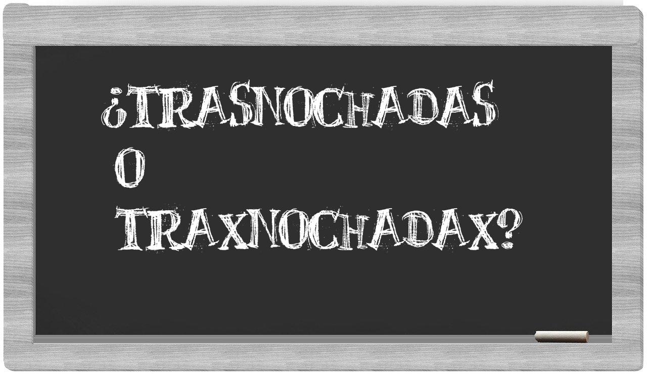 En la particular circunstancia que se presenta entre los términos trasnochadas y traxnochadax, nunca deberías titubear, puesto que únicamente trasnochadas se encuentra correctamente redactado. Por otro lado, traxnochadax no se halla en el léxico de la Real Academia Española.