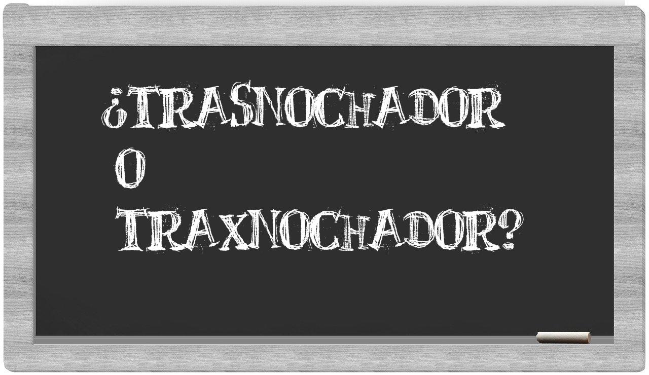 Cuando se presente la elección entre trasnochador y traxnochador, no vaciles ni un instante, porque únicamente trasnochador es la opción que se encuentra debidamente registrada en el Diccionario de la Real Academia Española, mientras que traxnochador carece de tal reconocimiento.