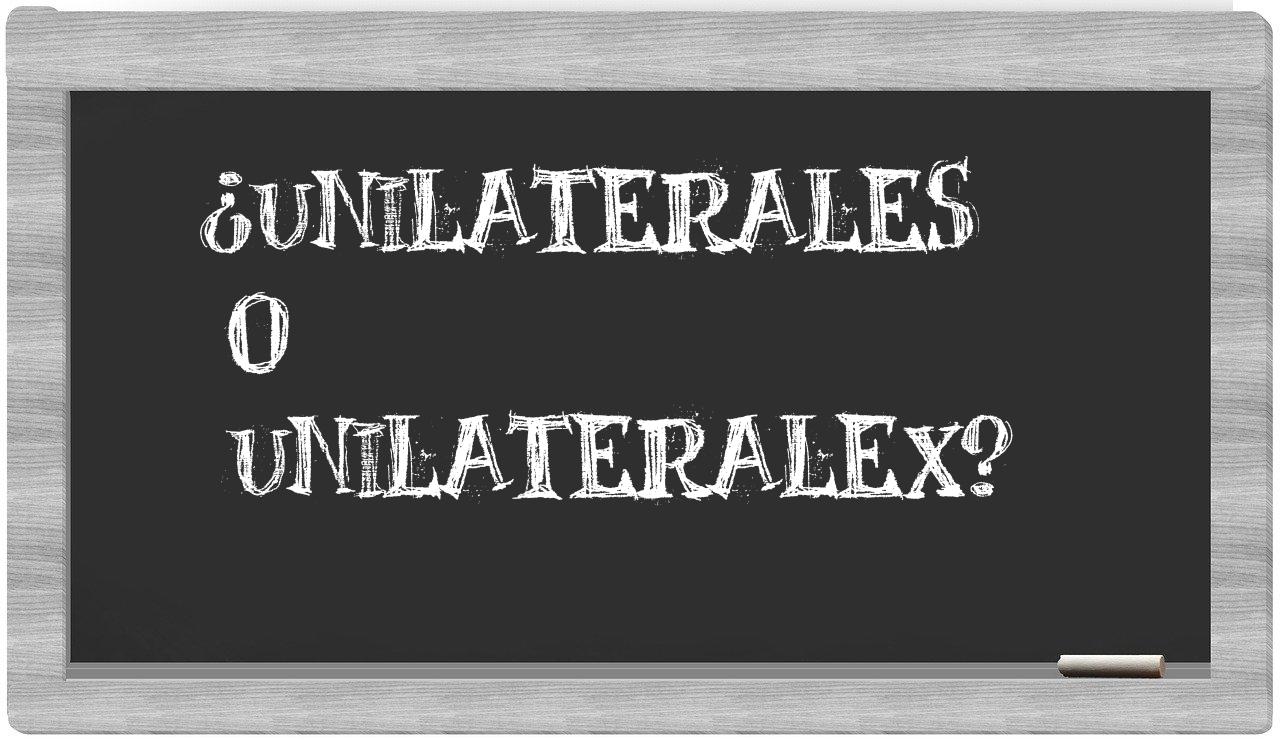 En la situación particular en la que se encuentran los términos unilaterales y unilateralex, no debes titubear, dado que únicamente unilaterales se encuentra correctamente redactada; unilateralex, por el contrario, no figura en el Diccionario de la Real Academia Española.